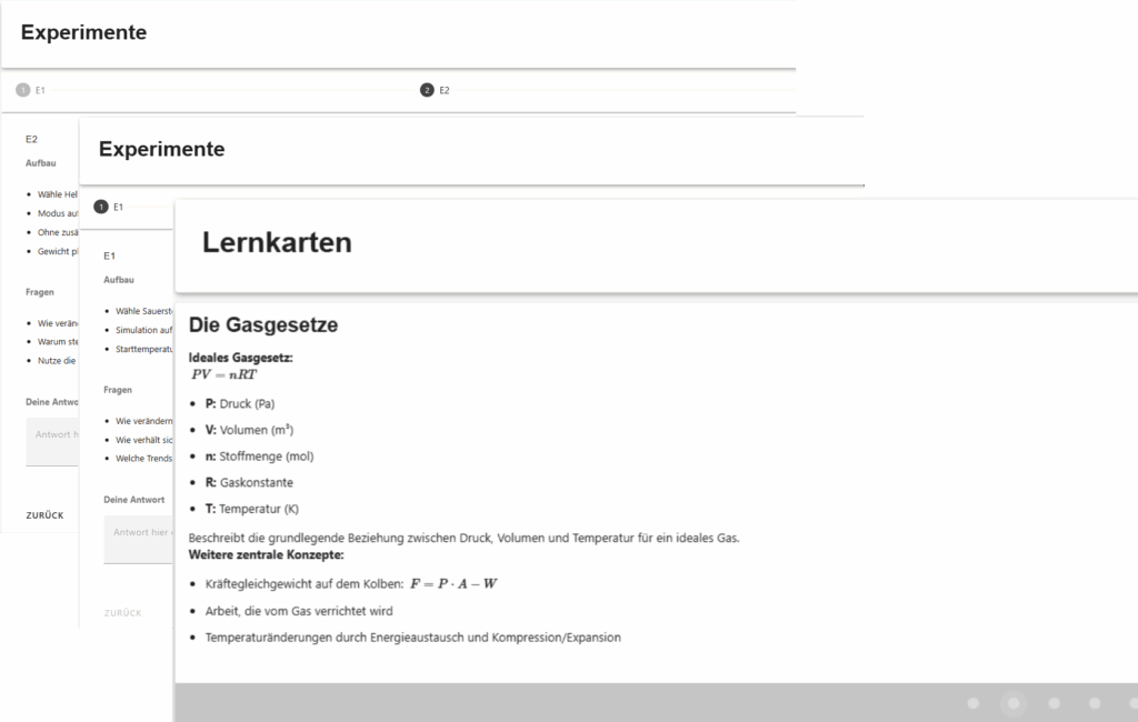 Jede Simulation enthält mehrere Experimente, die von einfach bis anspruchsvoll aufgebaut sind – Schüler:innen werden von der Theorie bis zur Reflexion begleitet. So sparen Lehrkräfte Zeit und Schüler:innen bleiben motiviert.